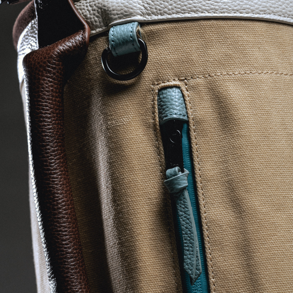 Introducing our Retro Sunday bag - inspired by the calm, early morning light. This bag blends soft cream tones, warm brown accents with a touch of light ocean blue. A retro but timeless silhouette, crafted in heavy duty waxed canvas & luxury premium leather.